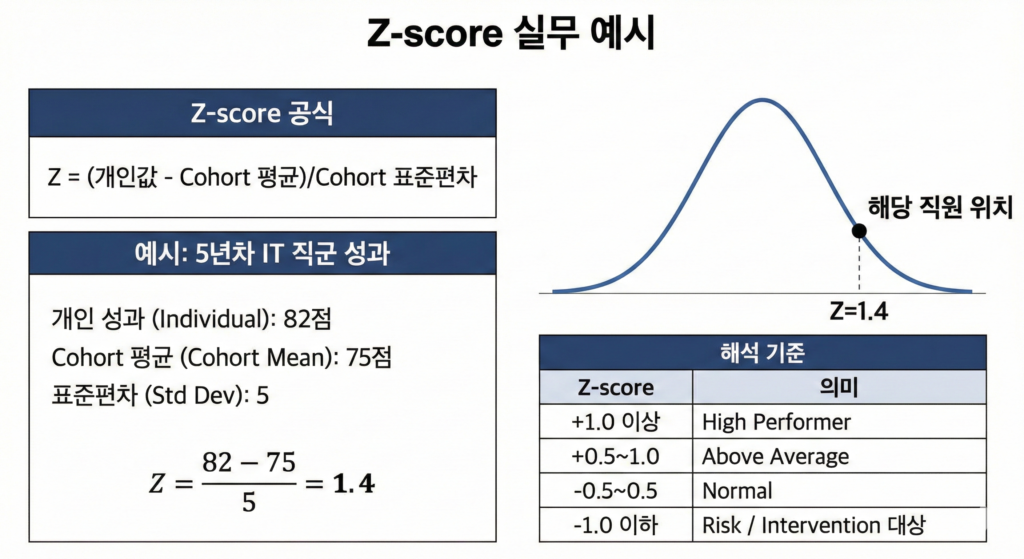 ➡ 해당 직원은 Cohort 내 상위 약 8~10% 수준 (정규값 1.4에 해당하는 확률 분포)