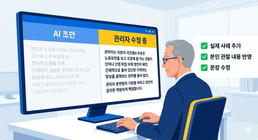 AI는 문장 구조를 돕고 최종 판단과 책임은 관리자에게 남겨둔다.